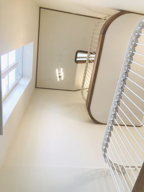 Bij het eerste bezoek werden we direct enthousiast van de verborgen zichten op de pracht van Brugge. Het was vooral een uitdaging om het zwaar programma van de school te verzoenen met de eisen van monumentenzorg, toegankelijkheid, de brandweer en de buren. Vele lagen werden gestript en de tweede traphal die gevraagd werd omwille van het schoolprogramma bracht een uitgelezen kans met zich mee om terug licht tot diep in het gebouw te brengen. De zolder werkten we open tot in de nok. De leraarsruimte nestelt zich hier gemoedelijk onder de oude spanten. Als kers op de taart is er het dakterras/groendak, met een zicht op het Belfort van Brugge. Ondanks de vele lijken die het gebouw in zijn kasten had, was dit een zeer fijne samenwerking met een bevlogen en sociaal geëngageerde bouwheer.